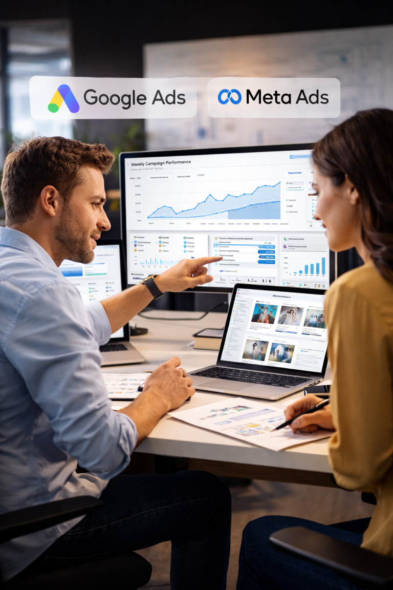 Integra gestión avanzada de redes sociales, campañas publicitarias, optimización de presencia digital y análisis continuo de resultados.